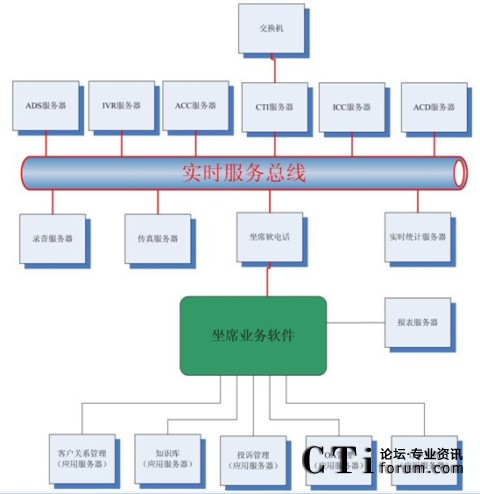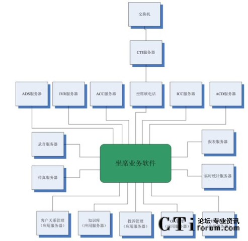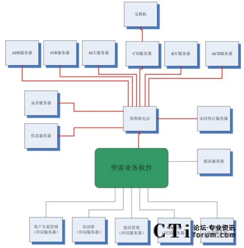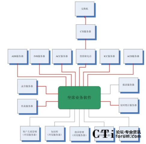 很多集成商或業(yè)務軟件開發(fā)商認為這種結(jié)構(gòu)過于復雜,而他們自身往往提供“整體解決方案”,即所有的服務器軟件基本上都是自己的,根據(jù)客戶的要求修改即可。例如,客戶關系管理、知識庫、投訴管理、OA、訂單管理以及坐席軟電話、ADS服務器、IVR服務器、ACC服務器、ICC服務器、ACD服務器、錄音服務器、傳真服務器、報表服務器、實時統(tǒng)計服務器都是自己來做,那么對于很多接口環(huán)節(jié)都可以節(jié)省了。