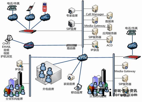 分布接入、分布座席、集中管理:由獨立接入、獨立座席的多個子系統(tǒng)組成一個完整系統(tǒng)。接入、座席、IVR/FAX 分布,但系統(tǒng)可統(tǒng)一處理、統(tǒng)一監(jiān)控、統(tǒng)一管理。