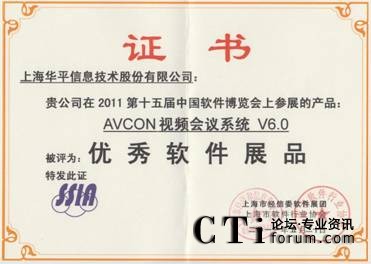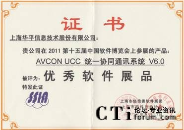 CTI論壇(ctiforum)6月1日消息(記者 潘婷婷): 近日,由工業(yè)和信息化部、國家發(fā)展和改革委員會、科學技術部、國家外國專家局和北京市人民政府共同主辦,中國軟件行業(yè)協(xié)會、中國電子信息產業(yè)發(fā)展研究院等單位承辦的第十五屆中國國際軟件博覽會參評軟件產品評獎揭曉,經過專家組的嚴格評審及在技術領先性、應用價值等評審指標下,由上海市經信委軟件展團及上海市軟件行業(yè)協(xié)會共同頒發(fā)華平股份優(yōu)秀組織獎,所參展的 “AVCON UCC統(tǒng)一協(xié)同通訊系統(tǒng)V6.0”、“AVCON視頻會議系統(tǒng)V6.0”兩款產品被評為優(yōu)秀軟件展品。