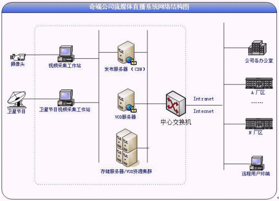 要在企業(yè)內網與廣域網上對有線電視、衛(wèi)星電視及現場視頻進行實時直播,這需要系統(tǒng)具備高兩種傳輸方式,內網實現組播協(xié)議,互聯(lián)網實現單播協(xié)議。同時要求系統(tǒng)傳輸速率、數據同步、數據流的分流、高穩(wěn)定性等特性。而實現網絡的視、音頻傳輸最好的解決方案就是流式媒體的傳輸方式。