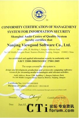 CTI論壇(ctiforum)07月17日消息: 日前,VIEWGOOD順利通過(guò)ISO27001信息安全管理體系國(guó)際認(rèn)證,成為首家通過(guò)該項(xiàng)認(rèn)證的專業(yè)流媒體技術(shù)供應(yīng)商。此舉標(biāo)志著VIEWGOOD在保障信息安全、提升企業(yè)管理水平方面,已經(jīng)全面接軌國(guó)際水平,并居于業(yè)內(nèi)領(lǐng)先地位。