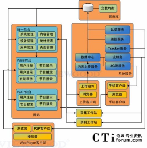 系統(tǒng)由“統(tǒng)一”管理后臺、Web前臺、WAP前臺、WebPlayer播放器、手機(jī)客戶端、采集工作站、錄制工作站、上傳客戶端、服務(wù)系統(tǒng)組成。之前已經(jīng)使用我們PC流媒體服務(wù)平臺的用戶,可以與手機(jī)流媒體系統(tǒng)合用一個(gè)后臺管理,實(shí)現(xiàn)了手機(jī)和PC平臺的統(tǒng)一后臺管理。