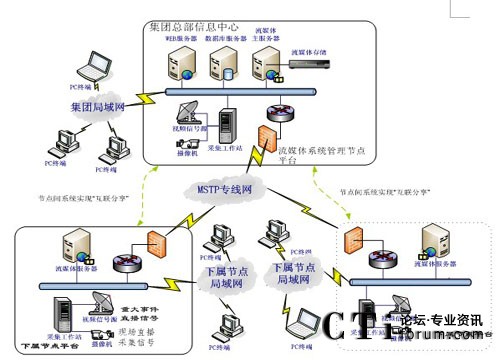 2、集團(tuán)與各下屬節(jié)點之間采用MSTP專線連接,可實現(xiàn)集團(tuán)總部視頻資源、網(wǎng)絡(luò)電視直播資源分發(fā)至各分節(jié)點;最終實現(xiàn)集團(tuán)總部和各下屬單位可以互聯(lián)分享各種實況直播、培訓(xùn)視頻資源等。