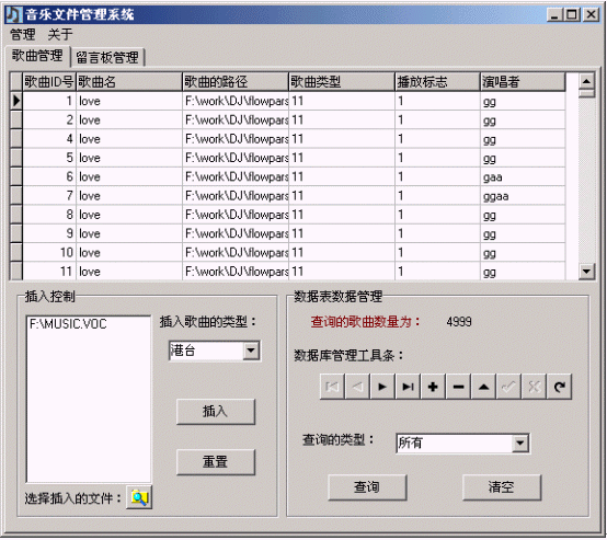 本軟件專門設(shè)計用來管理彩話系統(tǒng)中的音樂文件?捎迷撥浖M行歌曲的管理,包括插入,查詢,修改,刪除等操作。
