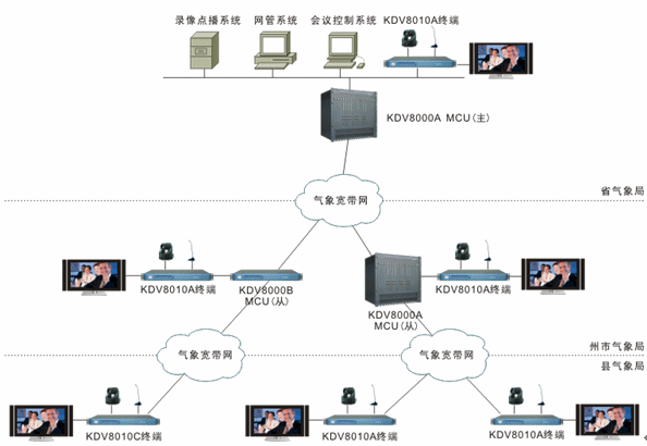 二期工程將實(shí)現(xiàn)州市到縣的建設(shè)。屆時(shí),州市氣象局既是省氣象局的遠(yuǎn)端節(jié)點(diǎn)又是縣氣象局的中心點(diǎn),可根據(jù)情況部署KDV8000A或KDV8000B多點(diǎn)控制單元,向上與省氣象局多點(diǎn)控制單元級(jí)聯(lián),向下與縣氣象局視頻會(huì)議終端相連。州市氣象局在一期工程中已配視頻會(huì)議終端,因此二期工程僅需在各縣氣象局部署KDV8010A或KDV8010C視頻會(huì)議終端各1臺(tái)即可,通過(guò)氣象寬帶網(wǎng)接入州市氣象局的多點(diǎn)控制單元。