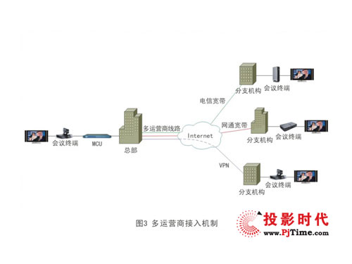 TrueSens視頻會(huì)議系統(tǒng)還具備科達(dá)創(chuàng)新的多運(yùn)營(yíng)商接入機(jī)制,可通過(guò)多個(gè)線路接入來(lái)自不同運(yùn)營(yíng)商網(wǎng)絡(luò)的終端,有效解決跨運(yùn)營(yíng)商接入時(shí)的帶寬瓶頸。如圖3所示。
