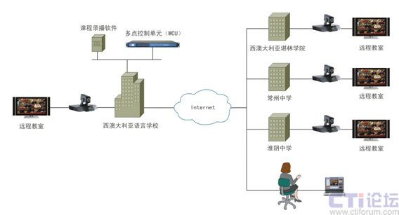 中澳遠(yuǎn)程教育系統(tǒng)采用科達(dá)KDV8000C多點(diǎn)控制單元(MCU)1臺和課程錄播軟件1套安裝在西澳大利亞語言學(xué)院,4臺TS6610視頻會議終端,分別安裝在西澳語言學(xué)院、堪林學(xué)院、常州中學(xué)和淮陰中學(xué)的遠(yuǎn)程教室。此外,考慮到遠(yuǎn)程授課的實際應(yīng)用需求,系統(tǒng)還提供了無線麥克接入方案。系統(tǒng)部署拓?fù)鋱D見下圖。