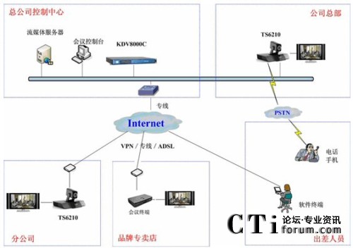 科達TrueSens視頻會議系統(tǒng)最大的特點就是擁有超強的網(wǎng)絡適應性。由于采用了高效視音頻編碼技術和大量智能化網(wǎng)絡適應技術,無論是ADSL、光纖還是VPN,均可進行快速接入,并充分保證在Internet環(huán)境下的會議效果。勁霸此次視頻會議系統(tǒng)就是基于Internet進行部署的。如圖1。