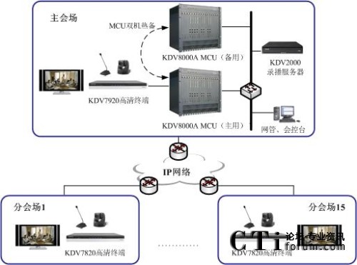 在充分了解用戶應(yīng)用需求的基礎(chǔ)上,2011年初科達(dá)為青島工商局規(guī)劃部署了一套高清視頻會(huì)議系統(tǒng)。其中,為了進(jìn)一步提升用戶的遠(yuǎn)程溝通體驗(yàn)和交互感,科達(dá)在市局主會(huì)場部署了1臺(tái)KDV7920高清視頻會(huì)議終端,在下屬14個(gè)分(市)局以及工商所分會(huì)場則各部署了1臺(tái)KDV7820高清視頻會(huì)議終端;而考慮到青島工商對于系統(tǒng)安全性、穩(wěn)定性方面的較高要求,科達(dá)則為其部署了 2臺(tái)KDV8000A多點(diǎn)控制單元(MCU)以實(shí)現(xiàn)雙機(jī)熱備;此外,系統(tǒng)還部署了KDV2000錄播服務(wù)器,以實(shí)現(xiàn)會(huì)議、培訓(xùn)過程的錄像和點(diǎn)播。整個(gè)系統(tǒng)通過工商局內(nèi)部的專網(wǎng)實(shí)現(xiàn)視音頻溝通和數(shù)據(jù)共享。