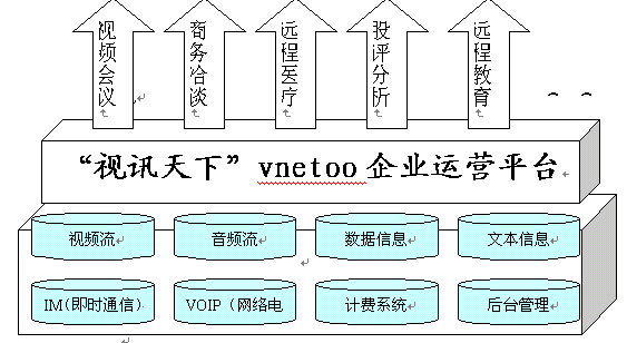 VNETOO視訊運(yùn)營平臺具有強(qiáng)大的數(shù)據(jù)功能和優(yōu)質(zhì)的音視頻效果,是集"視頻+語音+數(shù)據(jù)+IM(即時通信)+VOIP(網(wǎng)絡(luò)電話)+計費(fèi)+后臺管理"的基于IP網(wǎng)絡(luò)世界一流視訊服務(wù)提供平臺,它革命性地開創(chuàng)了視訊運(yùn)營領(lǐng)域的全新模式。(見圖表一:"視訊天下"vnetoo運(yùn)營平臺結(jié)構(gòu))。