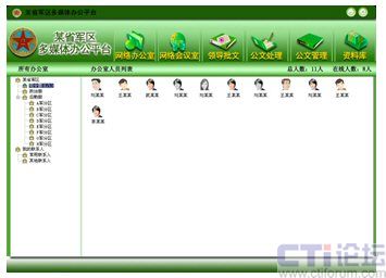 如圖所示的畫面即為網(wǎng)動(dòng)協(xié)同辦公系統(tǒng)的基礎(chǔ)工具——協(xié)同通訊系統(tǒng),該系統(tǒng)可將部隊(duì)機(jī)構(gòu)內(nèi)的所有部門、人員按照實(shí)際的組織結(jié)構(gòu)列出,應(yīng)用該系統(tǒng)的人員通過點(diǎn)擊其他在線人員,從而有選擇性的與對(duì)方進(jìn)行語音、視頻、數(shù)據(jù)共享、點(diǎn)對(duì)點(diǎn)會(huì)議等各種操作,將以往“看不見”的對(duì)話變?yōu)椤懊鎸?duì)面”的交流。相比于傳統(tǒng)的電話溝通而言,它不僅更暢通快捷,更可以最大化的降低溝通成本。另外,數(shù)據(jù)共享功能還可以將軍隊(duì)里需共同探討的話題,如作戰(zhàn)地圖動(dòng)態(tài)研究、工作報(bào)告資料等實(shí)時(shí)顯示在數(shù)據(jù)區(qū)中,雙方通過電腦即可進(jìn)行遠(yuǎn)程的話題討論、圈點(diǎn)批注。