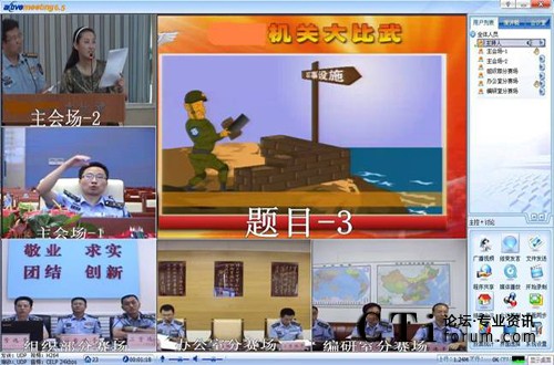 本次架設(shè)的空軍大比武平臺,滿足了總部主持指揮協(xié)調(diào)和各二級部參加比賽的應(yīng)用?偛颗c各二級部分別架設(shè)網(wǎng)動視頻會議硬件終端,分會場觀眾通過登錄網(wǎng)動統(tǒng)一通信平臺Active UC®觀看實時比賽畫面,并與現(xiàn)場互動、點評?偛恐鞒秩丝晒蚕韰①惒块T的答題桌面,把答題結(jié)果展現(xiàn)給評委和各會場觀眾。系統(tǒng)可實現(xiàn)舉手搶答,答題結(jié)果實時上傳等貼心功能。