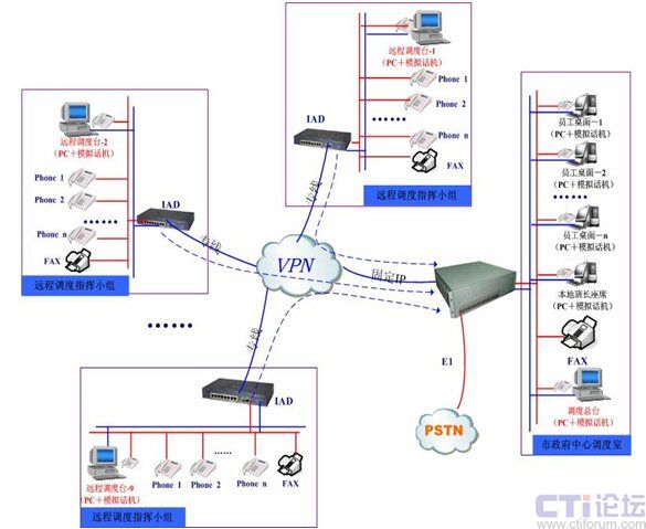 本次項目中,融天科技為大連市政府部署的防火調(diào)度指揮系統(tǒng)涉及點包括市政府中心調(diào)度室和分布在大連市各轄區(qū)的9個遠程指揮小組,中心調(diào)度室通過RT-CCP1000一體化調(diào)度平臺部署10個中心調(diào)度值班員,轄區(qū)的9個遠程指揮小組通過大容量IAD設備和政府VPN專網(wǎng)遠程注冊到中心調(diào)度室RT-CCP1000平臺上,同時RT-CCP1000平臺與本地的PSTN通過一條數(shù)字中繼E1連接,作為系統(tǒng)的出入口。如下圖所示: