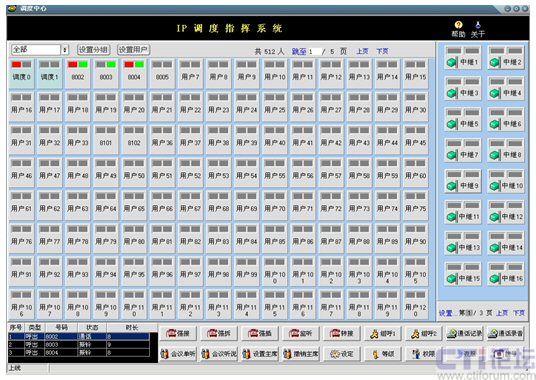在此界面中實現(xiàn)了配置管理功能和呼叫相關功能。配置管理分為:設置、修改和刪除分組,設置用戶,設置中繼,翻頁等功能;呼叫相關功能:強接、強拆、強插、監(jiān)聽、轉(zhuǎn)接、組呼、設定等級、設定權限、設定夜服、會議相關等功能。另外,可以在本軟調(diào)度系統(tǒng)中檢索瀏覽相關通話記錄,并可對錄音進行回放。