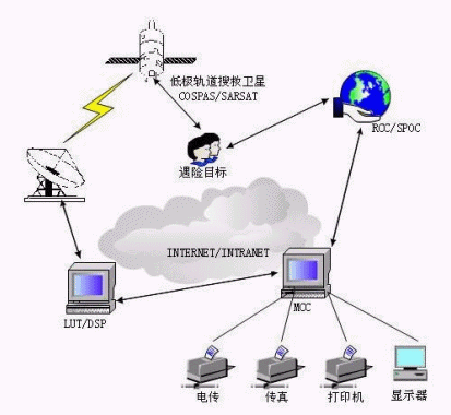 當(dāng)用戶(hù)(船舶、飛機(jī)或個(gè)人)遇險(xiǎn)后,遇險(xiǎn)示位信標(biāo)可以通過(guò)人工或者自動(dòng)由遇險(xiǎn)時(shí)的撞擊、水浸而激活(信標(biāo)激活后可以存活48/小時(shí)),發(fā)出121.5MHz/243MHz/4O6MHz的遇險(xiǎn)報(bào)警信號(hào),搜救衛(wèi)星則對(duì)遇險(xiǎn)示位信標(biāo)發(fā)出的遇險(xiǎn)報(bào)警信號(hào)進(jìn)行變頻、存儲(chǔ)、轉(zhuǎn)發(fā)等處理并轉(zhuǎn)發(fā),由幾個(gè)數(shù)據(jù)信號(hào)處理器(DSP)對(duì)衛(wèi)星的下行信號(hào)中的121.5MHz、243MHz、406MHz信號(hào)進(jìn)行實(shí)時(shí)處理或?qū)?06MHz信號(hào)進(jìn)行延時(shí)處理。由遍布全球的地面處理分系統(tǒng)本地用戶(hù)終端(LUT)接收并計(jì)算出遇險(xiǎn)目標(biāo)的位置,把信標(biāo)的報(bào)警數(shù)據(jù)和統(tǒng)計(jì)信息送給相應(yīng)的搜救任務(wù)控制中心(MCC)。