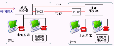 如某些城市勞動(dòng)和社保是業(yè)務(wù)分開(kāi),為共用12333接入號(hào)可采取此種方式,在呼叫首次接入時(shí)提示用戶選擇勞動(dòng)、還是社保咨詢服務(wù),如果選擇社保服務(wù)則通過(guò)DDN專(zhuān)線或VOIP將呼叫接入到社保的交換機(jī)中。
