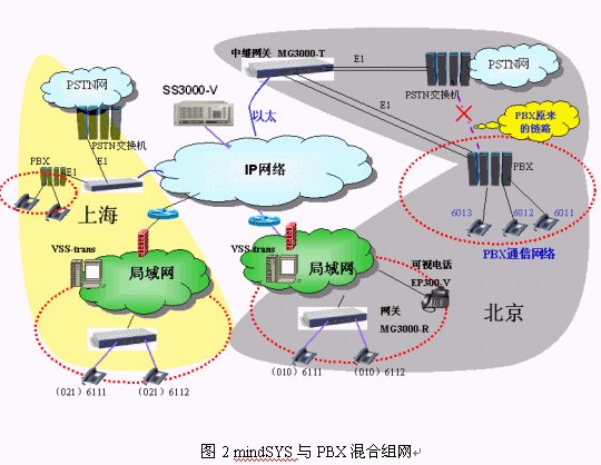我們建設(shè)mindSYS系統(tǒng)的時候基本上不改變原來PBX的布線和配置,PBX原來的數(shù)字中繼直接連接到運營商的程控交換機(jī),我們現(xiàn)在只是將PBX的數(shù)字中繼連接到中繼網(wǎng)關(guān)MG3000-T。PBX通信系統(tǒng)的電話完全沒有改變,還使用原來的電話號碼,打分機(jī)直接撥小號,打外線先撥0。mindSYS系統(tǒng)下的電話使用方式也完全一樣,對用戶來說就是一套系統(tǒng)。如北京的6011可以直接撥打6111,6111用戶也可以直接撥打6011,6111打外線先撥0,如062043020。北京的用戶呼叫異地用戶需要撥打完整號碼(大號),如北京的6011用戶撥0216111就可以接通上海的用戶,反之亦然。mindSYS系統(tǒng)的電話(圖2的所有電話)之間通話都免費。這樣我們的行業(yè)用戶可以既不改變原來的使用習(xí)慣,又能夠靈活的規(guī)劃各地的電話號碼來完成一個大型的跨地域的電話系統(tǒng)。