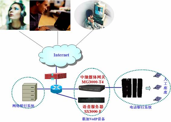 如圖,新加SIP融合通信平臺(tái)SS3000-E,完成客戶端軟電話的注冊(cè)、呼叫控制等功能;部署中繼媒體網(wǎng)關(guān)連接數(shù)據(jù)網(wǎng)絡(luò)和電話銀行系統(tǒng)的程控交換機(jī)。