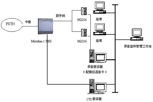 使用Meridian 2216 ACD數(shù)字話機上的錄音端口,直接接入模擬語音卡,進行錄音監(jiān)控。其物理結構如下所示: