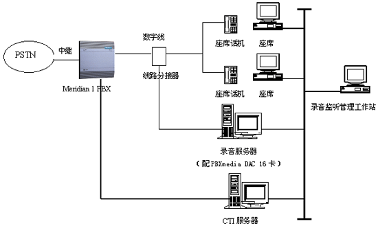 使用Music Telecom PBXmedia DAC 16線數(shù)字PBX錄音監(jiān)聽接口卡,直接與北電Meridian 1交換機的數(shù)字用戶線的分接線連接,實現(xiàn)并線錄音。其物理結構如下所示: