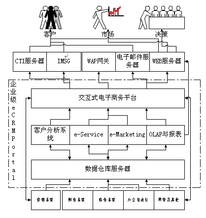 交互式電子商務(wù)平臺:負責(zé)將企業(yè)內(nèi)部的系統(tǒng)和企業(yè)的電子渠道(如:WEB、電子郵件、WAP、手機短消息和呼叫中心(Call Center)等)與企業(yè)內(nèi)部的業(yè)務(wù)系統(tǒng)(如:銷售系統(tǒng)、ERP系統(tǒng))等連接起來共同為客戶提供更為有效的服務(wù)。