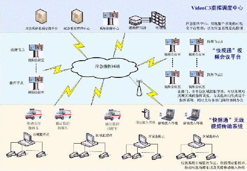 C3I視頻應急指揮協(xié)同系統(tǒng)在政府IP網(wǎng)絡中處于城市的神經(jīng)中樞。它將政府各個部門、單位聯(lián)系成為一個整體。在C3I視頻應急指揮協(xié)同系統(tǒng)的前端,由"快照通"無線視頻傳輸系統(tǒng)對政府所屬各個單位進行實時監(jiān)控,時刻掌握現(xiàn)場動態(tài),該部分支持固定點監(jiān)控,也支持移動指揮點和無線移動接入終端,保證了前方工作的靈活、機動性;在系統(tǒng)的指揮中心部分,由VideoC3指揮調(diào)度中心來支持,它一方面需要對前端的監(jiān)控信息進行控制,同時,要對整個政府進行綜合管理調(diào)度,在發(fā)生突發(fā)狀態(tài)的時刻,現(xiàn)場前端"快照通"捕獲的相應信息通過C3I系統(tǒng)平臺,迅速傳遞至指揮中心部分,政府管理人員通過VideoC3指揮調(diào)度中心對前端進行遠程指揮,在第一時間緊急處理現(xiàn)場突發(fā)事件;在整個C3I系統(tǒng)中,政府各個部門、單位之間通過"快視通"視頻會議平臺進行辦公交流,支持各部門間的協(xié)同辦公,同時,也可以通過其實現(xiàn)對所屬區(qū)域的指揮調(diào)度。