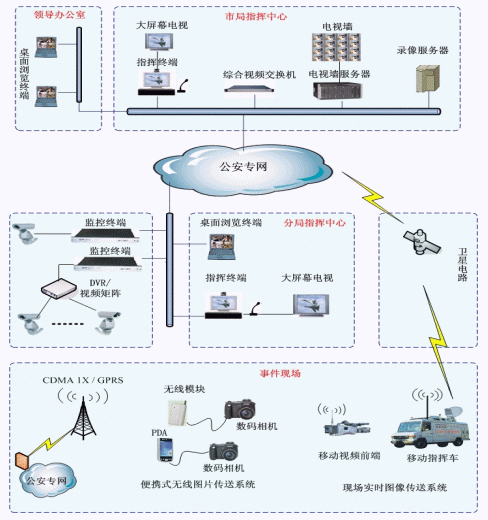 系統(tǒng)分3個(gè)層次,市局指揮中心、區(qū)縣分局(交警、消防)指揮中心、移動(dòng)指揮終端(現(xiàn)場指揮中心),主要設(shè)備包括:綜合視頻交換機(jī)、指揮終端、監(jiān)控終端、電視墻服務(wù)器、存儲(chǔ)錄像服務(wù)器、瀏覽終端、移動(dòng)視頻前端、搞清晰圖片傳輸系統(tǒng)等。系統(tǒng)結(jié)構(gòu)如圖示。
