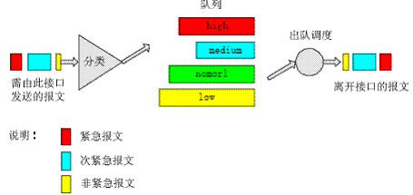 在報文到達路由設備接口后首先對報文進行分類,然后按照報文所屬的類別讓報文進入所屬隊列的尾部,在報文發(fā)送時按照優(yōu)先級總是在所有優(yōu)先級較高的隊列中的報文發(fā)送完畢后再發(fā)送低優(yōu)先級隊列中的報文,這樣在每次發(fā)送報文時總是將優(yōu)先級高的報文先發(fā)出去,保證了屬于較高優(yōu)先級隊列的報文有較低的時延與丟失率。