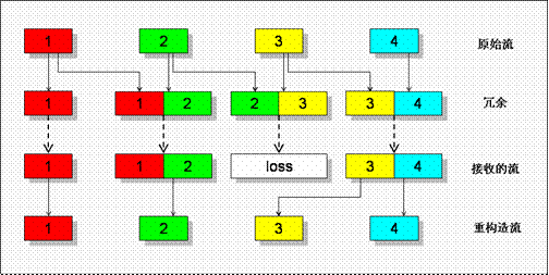 當第3個包在傳輸過程中丟失時,由于包“3”被冗余編碼到第4個傳輸包中,在對端接收到碼流后還可以正常重構出包“3”。