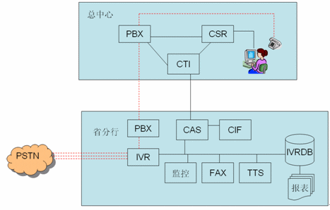 - 各分行采用IVR前置模式,通過PSTN直接接入到IVR服務(wù)器坐自動語音服務(wù)。