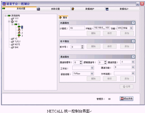 在局域網(wǎng)內(nèi)的任何一臺客戶機上,系統(tǒng)管理員通過客戶端控制程序訪問主機系統(tǒng)設(shè)置數(shù)據(jù)庫,具有系統(tǒng)管理員權(quán)限的客戶帳戶均可登錄進入AllContral系統(tǒng)控制臺程序。通過這個基于客戶端的程序,系統(tǒng)管理員可完成PABX設(shè)置、ACD設(shè)置、IVR設(shè)置等許多系統(tǒng)管理和配置工作。