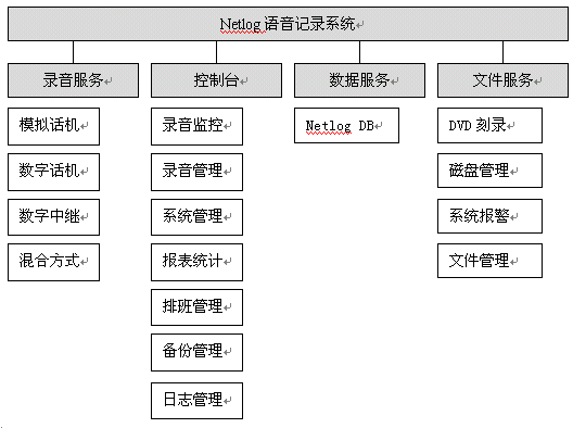 NetLog語音記錄系統(tǒng)采用基于分布式、多層控制管理體系的設(shè)計(jì)思想,將電話線路與內(nèi)部網(wǎng)絡(luò)有效地結(jié)合在一起,形成一套完整的語音錄制、管理系統(tǒng)。采用目前先進(jìn)的C/S模型,能更方便、快捷地實(shí)現(xiàn)控制臺對網(wǎng)絡(luò)內(nèi)所有記錄服務(wù)的狀態(tài)監(jiān)視,記錄查詢,操作控制等,采用統(tǒng)一的管理化機(jī)制,使文件的管理和備份更簡潔。