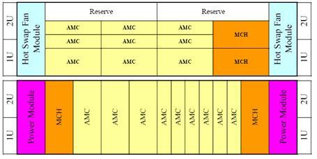 Carrier Manager)。即,MicroTCA系統(tǒng)的MCH相當(dāng)于ATCA系統(tǒng)的ShMC+Fabric+Carrier。MCH采用了與AMC完全相同的連接方式,結(jié)構(gòu)尺寸與半寬全高的AMC模塊完全相同,連接方式也完全相同。