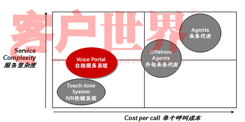 讓我們來(lái)看看這張圖。這張圖縱軸是服務(wù)的復(fù)雜度,橫軸是單位呼叫成本,傳統(tǒng)的IVR(觸鍵的語(yǔ)音IVR)和人工服務(wù)相比,服務(wù)的復(fù)雜度可就差多了。而Voice Portal的概念是用比較少的成本做更多的業(yè)務(wù),從成本上講比原來(lái)的傳統(tǒng)的IVR可能成本稍微高一點(diǎn)點(diǎn),但是和人工服務(wù)相比,無(wú)論是和單位自建呼叫中心座席比,還是和外包呼叫中心座席比,成本都有很大降低,但業(yè)務(wù)復(fù)雜度可以做得比傳統(tǒng)IVR復(fù)雜很多。我們承認(rèn),就提供服務(wù)的內(nèi)容來(lái)講,Voice Portal今天仍然不能夠像人工那樣提供那么全面的服務(wù),但是可以涵蓋很多服務(wù)內(nèi)容,在這方面一是因?yàn)榧夹g(shù)先進(jìn)了,另一方面也在于引導(dǎo)。今天我看到越來(lái)越多的客戶(hù)已經(jīng)開(kāi)始有意識(shí)的推行自助服務(wù)形式。我前幾年去新加坡打出租,發(fā)現(xiàn)在新加坡有很多叫出租的車(chē)站,車(chē)站上有一個(gè)按鍵,按鍵上有一個(gè)編碼,說(shuō)明你在什么位置,當(dāng)你打通出租車(chē)客服的電話,你只要告訴這個(gè)編碼,他們就自然而然知道你在什么地方,并把要來(lái)接你的車(chē)車(chē)牌號(hào)通過(guò)語(yǔ)音報(bào)讀方式通知你。今天在中國(guó)也開(kāi)始有這種形式了。昨天我沒(méi)有開(kāi)車(chē),也算是支持北京市每周少開(kāi)一天車(chē)的號(hào)召,我打了出租,在和出租司機(jī)聊天的過(guò)程中,出租司機(jī)說(shuō)現(xiàn)在油價(jià)很貴,他們有很強(qiáng)烈的需求不愿意掃馬路,他們也有一個(gè)出租車(chē)叫車(chē)電話,那個(gè)呼叫中心大概有上百個(gè)坐席,這個(gè)公司有一萬(wàn)六千輛出租車(chē)在北京,由他們來(lái)進(jìn)行搶答,搶答完之后你可以告訴說(shuō)這個(gè)人在什么地方等,唯一不同的我們?cè)谧灾线沒(méi)有做得那么到位,司機(jī)搶到了活還要給客戶(hù)打一個(gè)電話,不象新加坡完全是自助的,你只要按了那個(gè)鍵,系統(tǒng)就知道你在什么地方,當(dāng)尋找到合適的車(chē)的時(shí)候,語(yǔ)音報(bào)讀你車(chē)牌號(hào)就行了。我和說(shuō)出租車(chē)師傅,那你打電話成本不是增加了嗎,他一笑,增加打一個(gè)電話的成本怎么也比掃馬路強(qiáng)。大家可以看看呼叫中心多有用,自助服務(wù)能省多少錢(qián)。