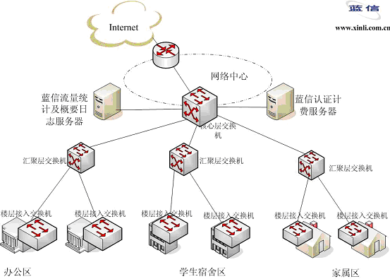 在網(wǎng)絡(luò)中心機房部署“藍信認(rèn)證計費系統(tǒng)”,藍信認(rèn)證計費系統(tǒng)除支持標(biāo)準(zhǔn)的RADIUS協(xié)議外,還支持領(lǐng)先的802.1x協(xié)議,通過與各接入層交換機的配合,實現(xiàn)了認(rèn)證管理功能。通過綁定帳號、IP、MAC地址等15元素,真正保證只有合法用戶才能通過認(rèn)證;對用戶進行分級權(quán)限管理,可按信用度等級對用戶進行劃分,方便了用戶的管理。此外,在網(wǎng)絡(luò)出口處部署藍信流量統(tǒng)計工具,通過與藍信認(rèn)證計費系統(tǒng)的配合,實現(xiàn)對用戶按流量來計費,可以把用戶訪問流量按校內(nèi)校外、國內(nèi)國際來區(qū)別對待,并設(shè)置不同的費率。同時,還部署了藍信概要日志系統(tǒng),有效記錄了用戶的上網(wǎng)信息,并提供人性化的web客戶端,方便管理者進行事后查詢,有效的控制了網(wǎng)絡(luò)的安全性。