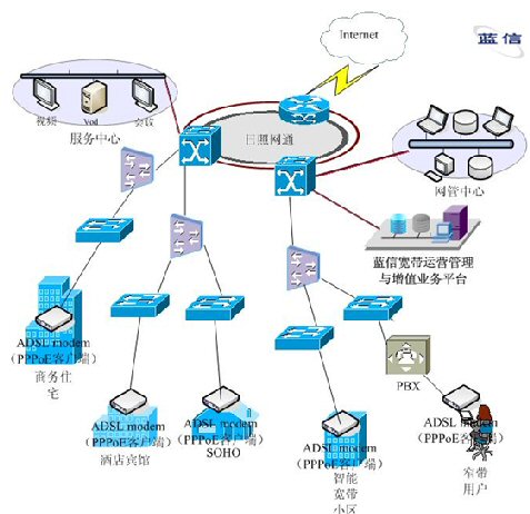 在以以太網技術為主建設的運營區(qū)域,在中心由一臺模塊化的核心交換機支持,輔以多臺BASE設備連接,在接入層用交換機做接入設備,保證用戶數(shù)據(jù)的快速傳播。在網絡核心處,部署信利公司的藍信寬帶認證計費系統(tǒng),負責對全網用戶的安全認證、計費及管理。藍信寬帶認證計費系統(tǒng)除支持標準的RADIUS協(xié)議外,還支持PPPoE、802.1x認證。在用戶終端處,部署藍信特制的PPPoE客戶端,實現(xiàn)撥號上網。