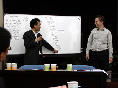 公開課在Simon Kriss先生詼諧的講課風格的引導下自始至終在輕松、愉快又不失專業(yè)深度的氛圍中進行著,而Simon Kriss先生以呼叫中心運營管理的高效率為主題,從呼叫中心的環(huán)境布局、預測管理、人力資源管理、效率管理到專業(yè)報告形式等知識點上做了專業(yè)深入的講解。尤其在人力資源管理和效率管理方法的傳授時引發(fā)了全體學員極大的興趣和反應,例如:就人員附著度的定義及操作問題學員同講師展開了多倫次的討論。而Simon