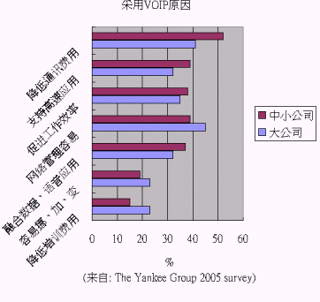 根據(jù)美國(guó)著名的咨詢公司 The Yankee Group 2005 年的調(diào)研各企業(yè)使用VOIP的原因,大企業(yè)與中小企業(yè)略有差異:大企業(yè)認(rèn)為網(wǎng)絡(luò)管理、省錢(qián)、促進(jìn)工作效率為最關(guān)鍵的三個(gè)原因;中小企業(yè)則認(rèn)為省錢(qián)、網(wǎng)絡(luò)管理容易、支持高速應(yīng)用、促進(jìn)工作效率為主要原因。