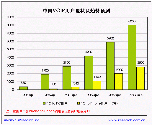 根據(jù)信息產(chǎn)業(yè)部的統(tǒng)計(jì),2005年上半年IP通話時(shí)長(去話)達(dá)到644.1億分鐘,同比增長17.4%,據(jù)iResearch預(yù)測,2008年中國的PC to Phone的VoIP電話用戶將達(dá)到2800萬戶(如圖1)。2004-2005年,中國IP電話業(yè)務(wù)保持較高速度增長,但增長率已經(jīng)有所下降,因此中國IP電話業(yè)務(wù)處于擴(kuò)張期?梢灶A(yù)見IP電話業(yè)務(wù)仍將保持增長,但增長率將持續(xù)下降。中國VoIP市場的特點(diǎn)可以歸納為:使用VoIP技術(shù)的應(yīng)用環(huán)境正在逐步成熟,尚需要迎接質(zhì)量、網(wǎng)絡(luò)帶寬、安全等方面的挑戰(zhàn)。