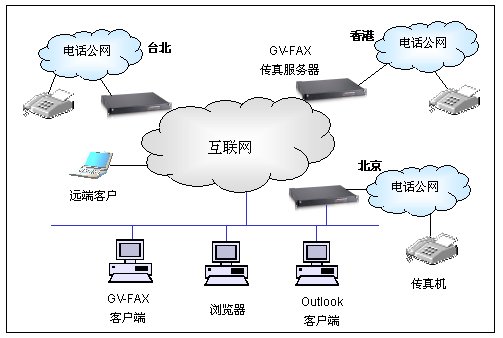 GV-FAX網(wǎng)絡(luò)傳真服務(wù)器IP傳真拓普?qǐng)D如下所示,以某集團(tuán)有三家分公司,分布在北京、臺(tái)北和香港三地為例: