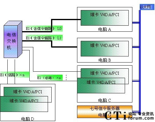 我們已知一個(gè)七號(hào)信鏈路組可以管理4096路話路,但在由于電腦速度的影響,單機(jī)容量很難超過(guò)480路(PCI),這樣在很多大容量系統(tǒng)中,我們的板卡就無(wú)法使用。在上圖所示的構(gòu)架中,只要增加電腦C類似的主機(jī)就可以了。