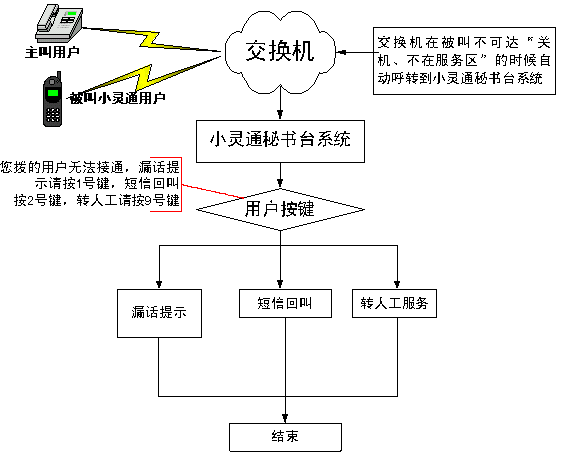 當(dāng)主叫用戶撥打被叫小靈通用戶,而被叫小靈通用戶處于不可達(關(guān)機、忙、不在服務(wù)區(qū))狀態(tài)時,該呼叫自動轉(zhuǎn)入轉(zhuǎn)到小靈通秘書臺系統(tǒng)后,用戶選擇短信回叫,系統(tǒng)在被叫小靈通用戶空閑后,會發(fā)送短信通知主叫用戶,被叫已經(jīng)恢復(fù)狀態(tài),可以呼叫。