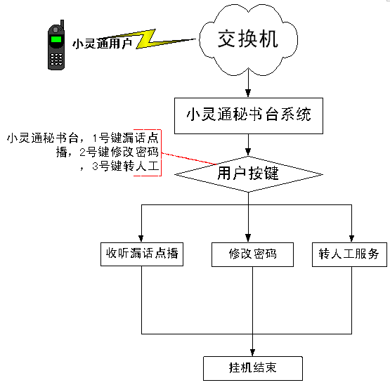 當(dāng)小靈通用戶撥打自動臺的時候可以收聽用戶的留言、設(shè)置或者修改收聽留言的密碼,也可以轉(zhuǎn)人工服務(wù),設(shè)置相關(guān)的服務(wù)條件。