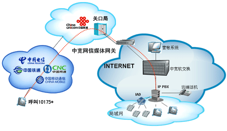 企業(yè)自行從網(wǎng)站上成功申請“企業(yè)商務(wù)通”業(yè)務(wù)后,通過101756*全國統(tǒng)一接入號結(jié)合網(wǎng)關(guān)和PBX,當外部對企業(yè)申請的10175*號碼發(fā)起呼叫時,該呼叫通過中國聯(lián)通的線路將話務(wù)指向中寬網(wǎng)信的媒體網(wǎng)關(guān),由中寬軟交換平臺將呼叫送至指定的PBX上,由PBX接續(xù)至總臺或相應(yīng)分機。另外,當您使用該業(yè)務(wù)外呼時,可以選擇在被叫電話上顯示10175*或隱藏號碼。