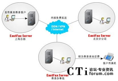 在上圖中,某集團(tuán)公司總部位于上海,在北京、香港有分支機(jī)構(gòu),與分支機(jī)構(gòu)及客戶之間經(jīng)常有大量的傳真往來。目前三個地方已通過VPN實(shí)現(xiàn)了網(wǎng)絡(luò)互通,且均安裝了EastFax傳真服務(wù)器。