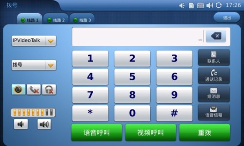 7寸大屏搭配寬大的數(shù)字虛擬鍵盤,讓你的撥號準確無誤。同時界面的所顯示的通話功能諸如查找聯(lián)系人、查找通話記錄、發(fā)送短消息或者快速進入語音信箱等功能也清晰明了。可以發(fā)現(xiàn)的是,用戶在輸完號碼之后可自主選擇采用語音呼叫還是視頻呼叫。另外,同潮流網(wǎng)絡之前的一款視頻電話GXV3140一樣的是,GXV3175也在出廠自帶了一個IPVideoTalk賬號。該賬號是出廠時就已配置好的,每一臺電話配備一個號碼并顯示在桌面上。也就是說,用戶在拿到GXV3175并聯(lián)網(wǎng)之后即可使用該賬號撥打免費的視頻電話了。這可是很多廠商所沒有的特殊功能。下面我們就使用隨機附送的IPVideoTalk賬號來撥打視頻電話。