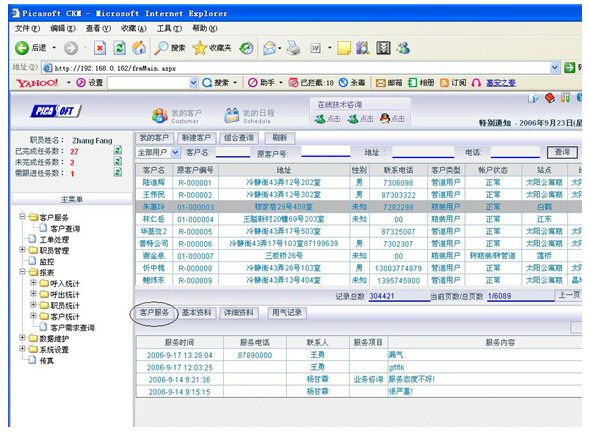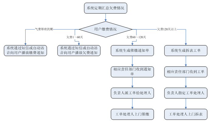 業(yè)務(wù)咨詢:用戶通過人工、自動語音等方式咨詢有關(guān)政策法規(guī)、資費標(biāo)準(zhǔn)、用氣常識、報裝方法等,系統(tǒng)以語音、傳真、Email、短消息等方式回復(fù)客戶。