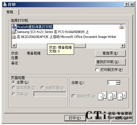 發(fā)送傳真配合PCS的虛擬打印軟件,打開一個(gè)文本,或者DOC文件,CTRL+P,選擇“PicaSoft虛擬傳真打印機(jī)”,如下圖: