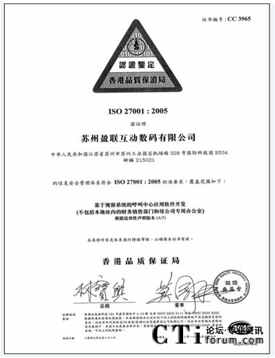 2009年9月28日,蘇州盈聯(lián)公司獲得了由國際權威認證機構香港品質保證局頒發(fā)的ISO 27001:2005(信息安全管理體系ISMS)國際認證證書,這標志著蘇州盈聯(lián)公司繼2008年7月通過CMMI3級評估之后又一見證企業(yè)資質與能力的重要里程碑。