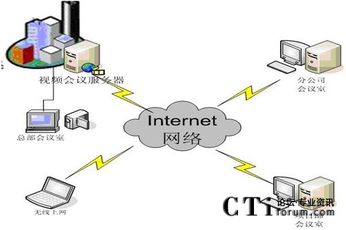 視維根據互聯(lián)網的網絡現(xiàn)狀和IT硬件資源制定了一套可行的平民化的低帶寬下的高清視頻會議解決方案。以企業(yè)總部為主會場,其他地區(qū)的分公司、各營銷網點和各移動多媒體終端作為分會場,其網絡拓撲圖如下: